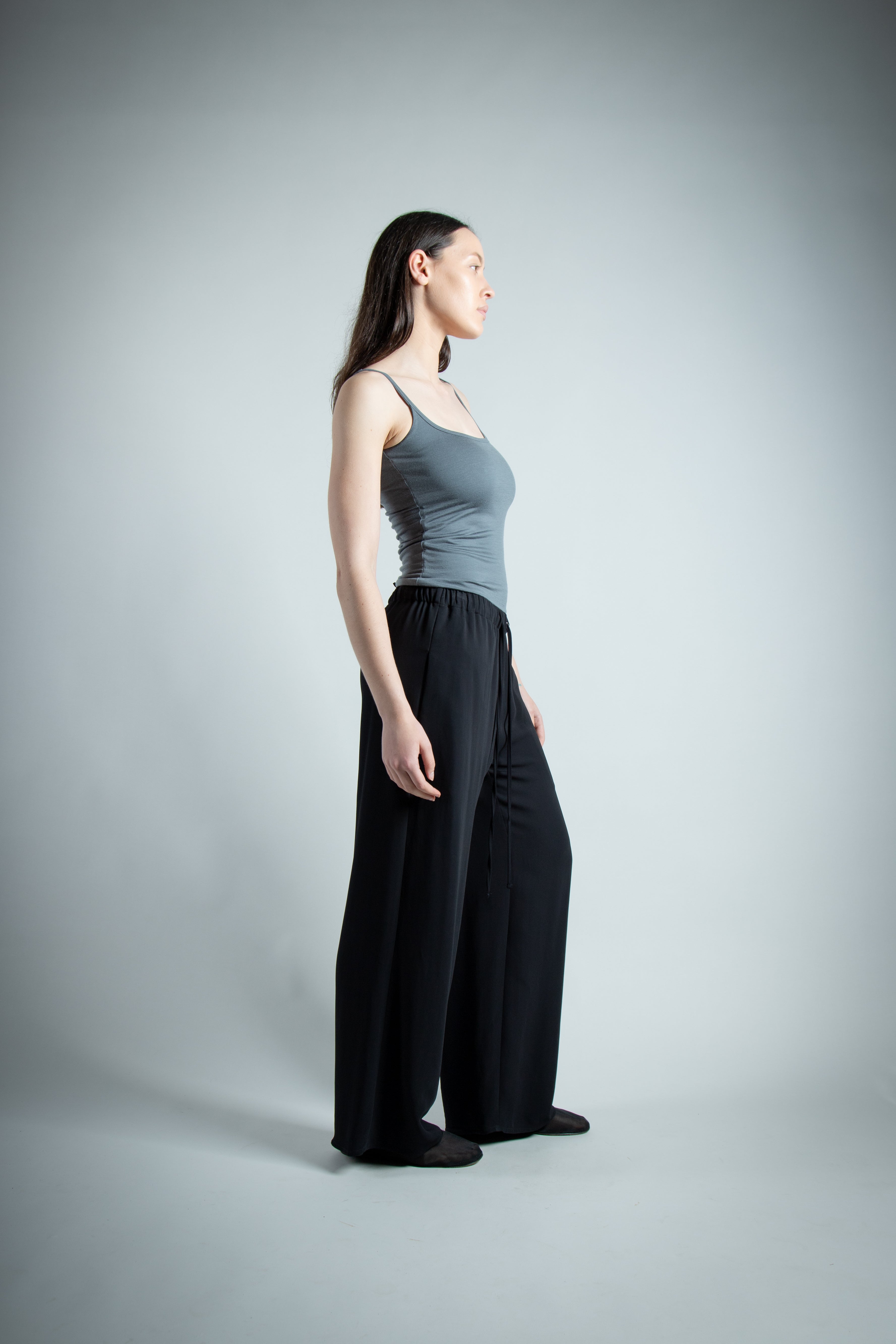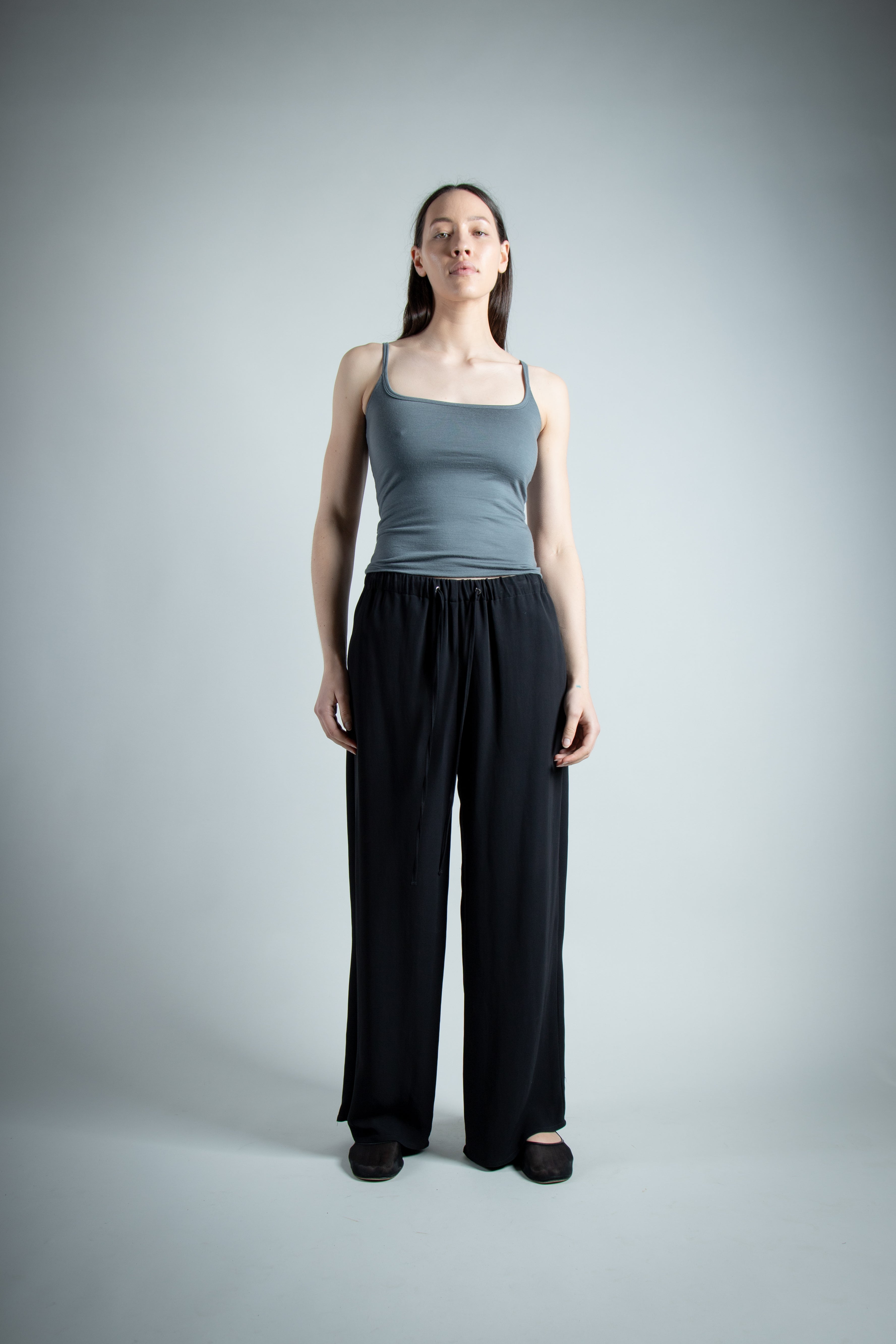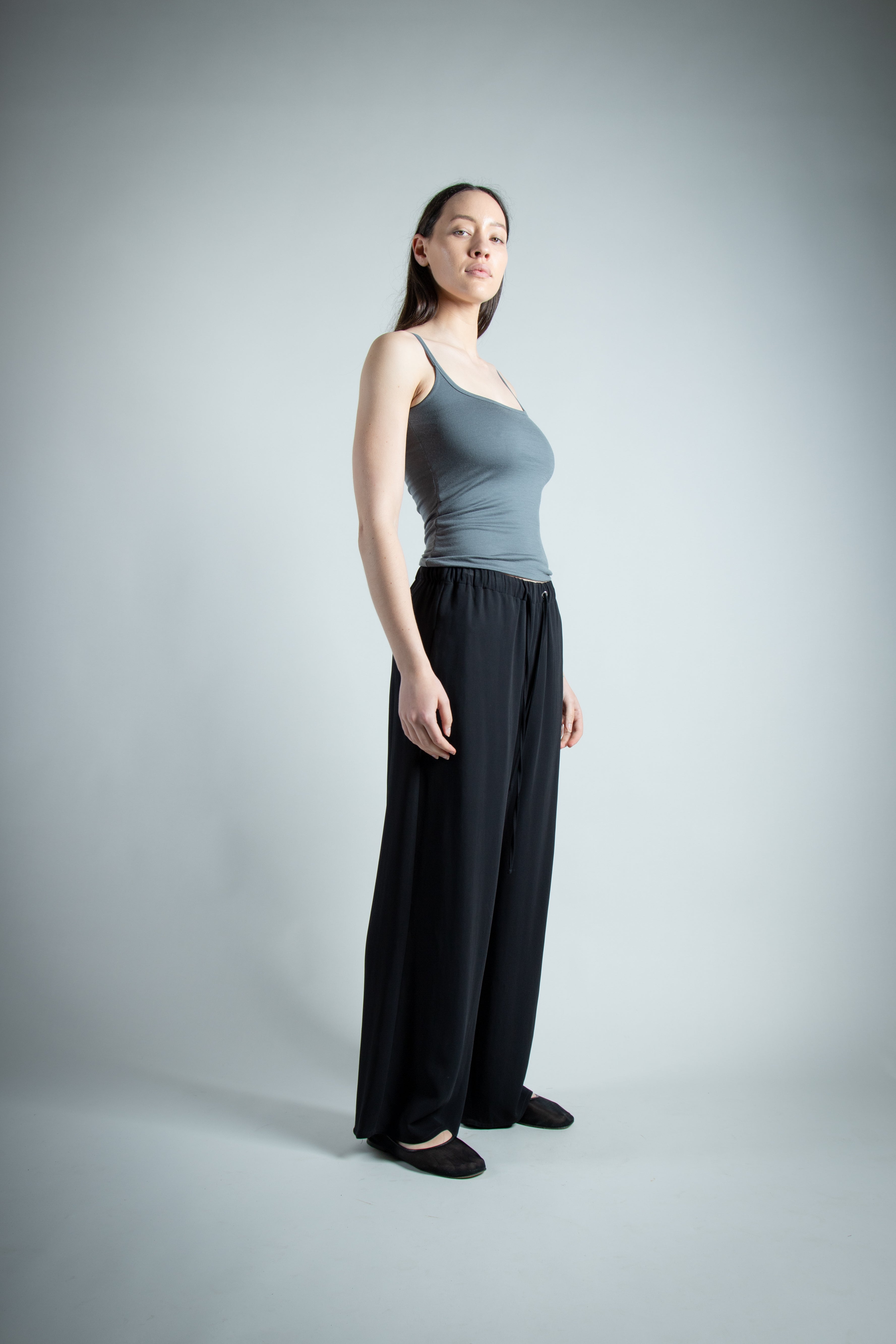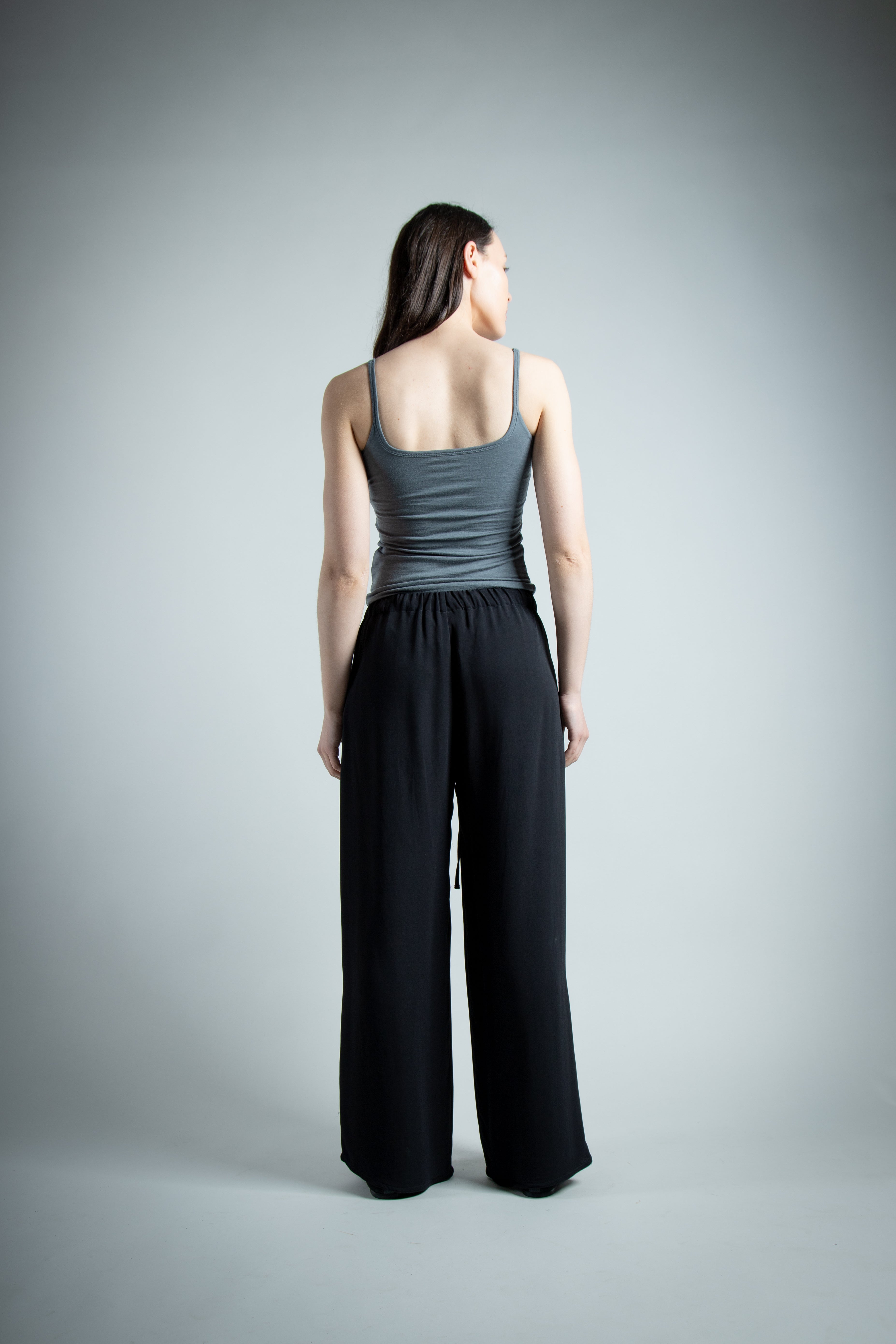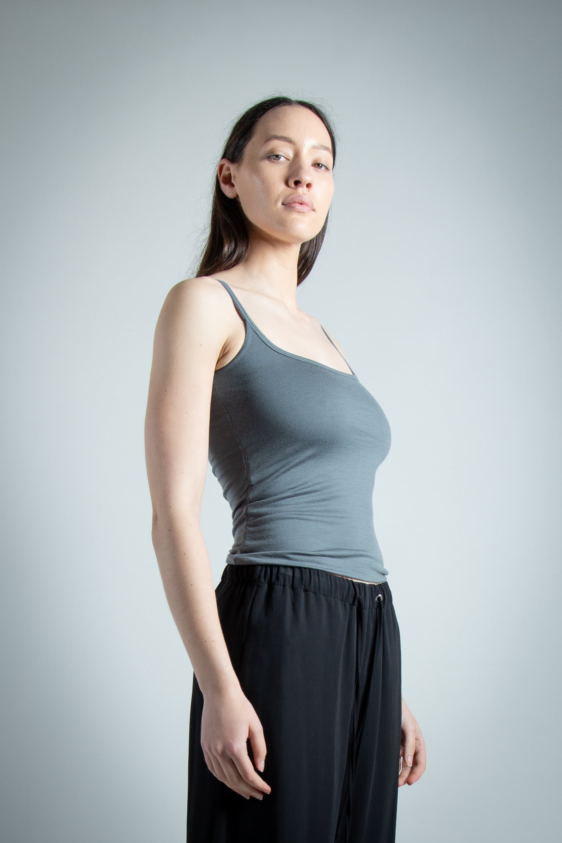 Our version of the classic Summer cami, doubled up. Merino jersey, with scoop neck at the front and back, with the entire singlet being two layers. Double fold binding to finish off the neckline to continue into the straps. Seamless fold line at the hem for a clean finish.