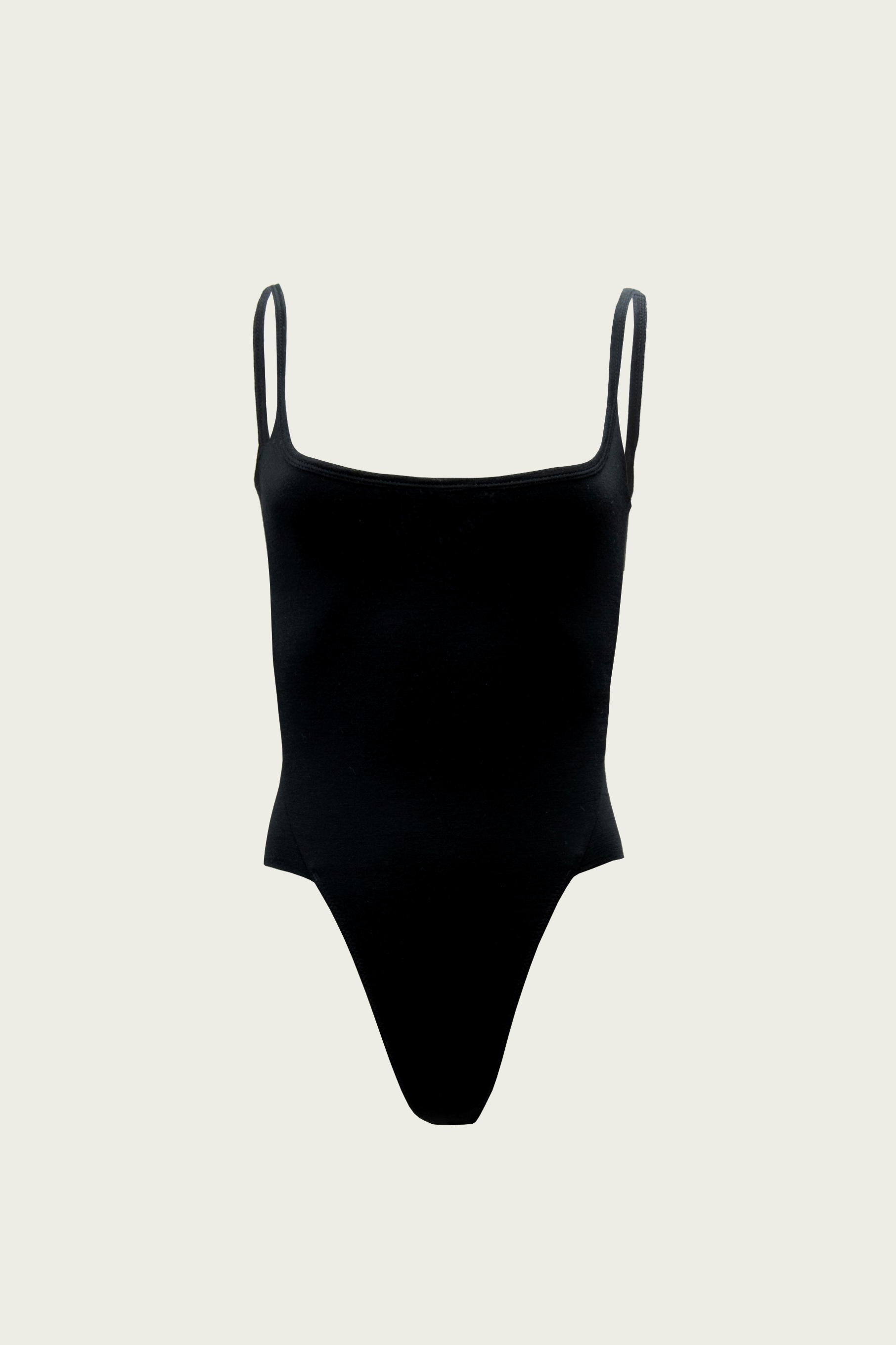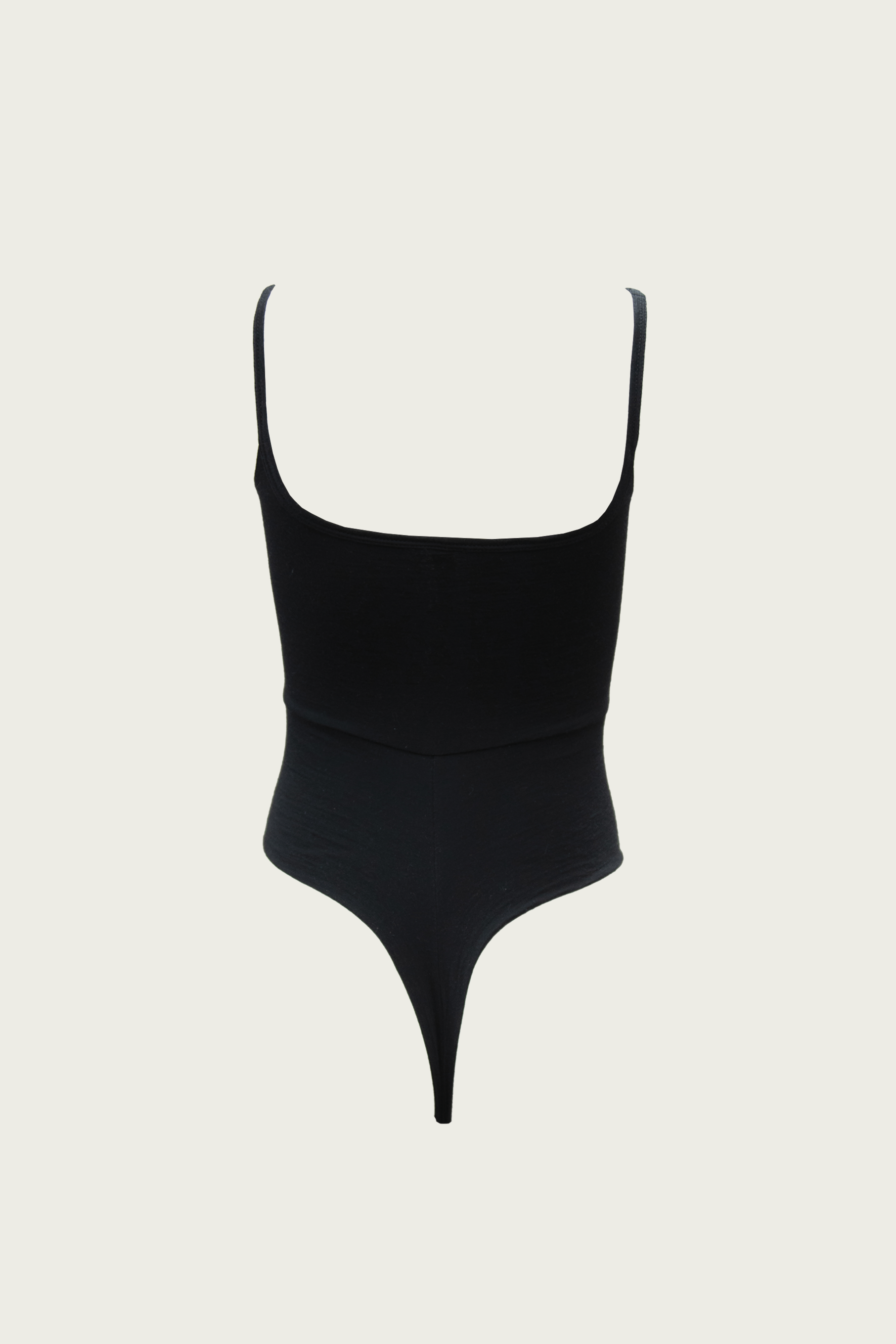 Merino bodysuit version of the classic Summer cami. Scoop neck front and back, and double layered throughout. Double fold binding to finish off the neckline to continue into the straps, and rubberised edges, sealed with a zigzag topstitch, for security. Folded edge at the side hip for a seamless finish, joining into a G-string shape at the back. Strategically positioned hook and eye closure at the crotch allows for ease of use, and variability in body length. Designed to be paired with our Brenda Bolero as pictured.