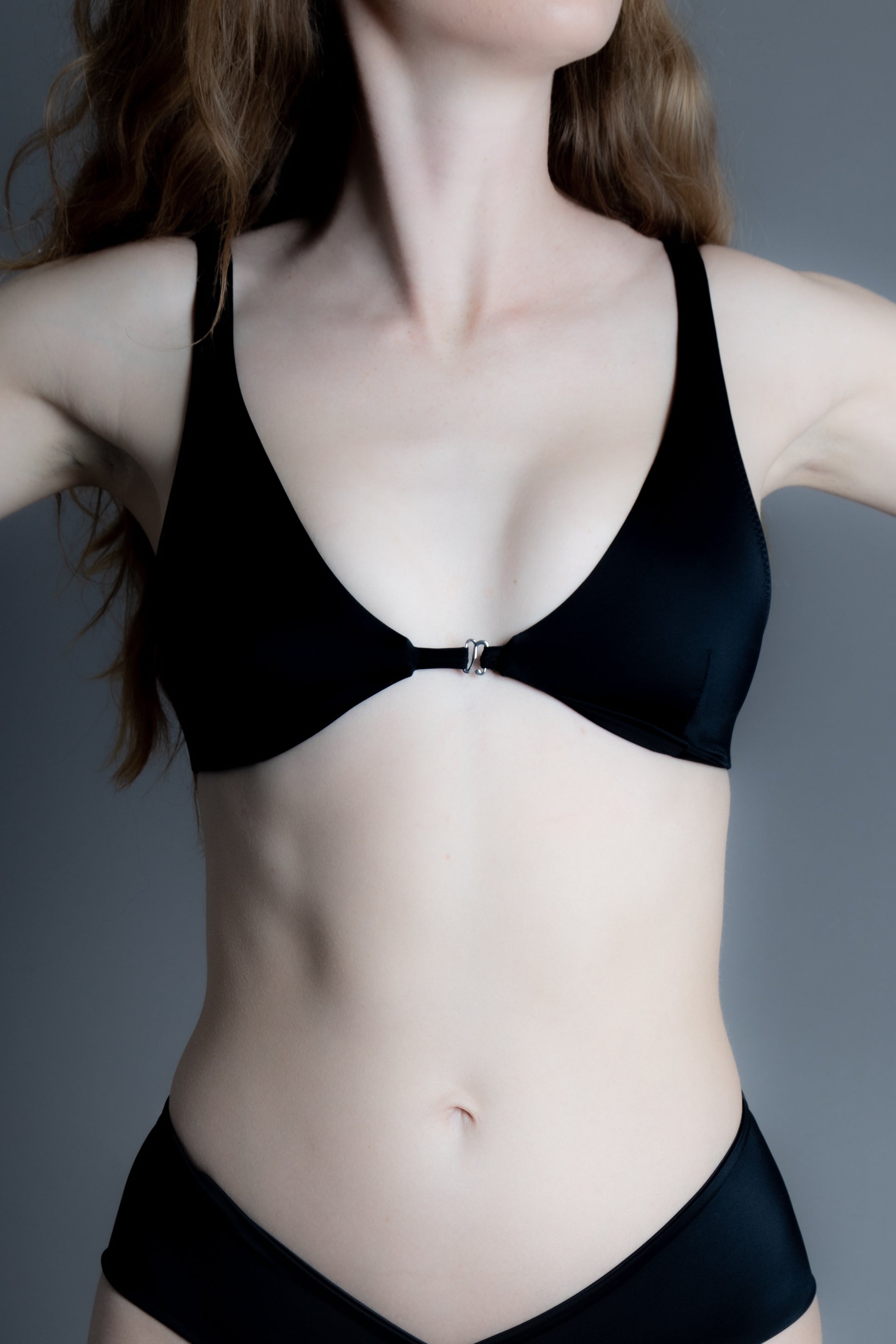 Bikini top bralette, with a nickel-free hook at the centre front to make getting into your swimsuit easier. Rubber elastic under bust for support. Made with ECONYL®  regenerated nylon with SPF 50+ sun protection, providing the piece with strength, complete coverage, and high chlorine resistance. Double layered style, shaped under the bust. Edged with concealed rubber elastic internally, to hold the swimsuit in place.