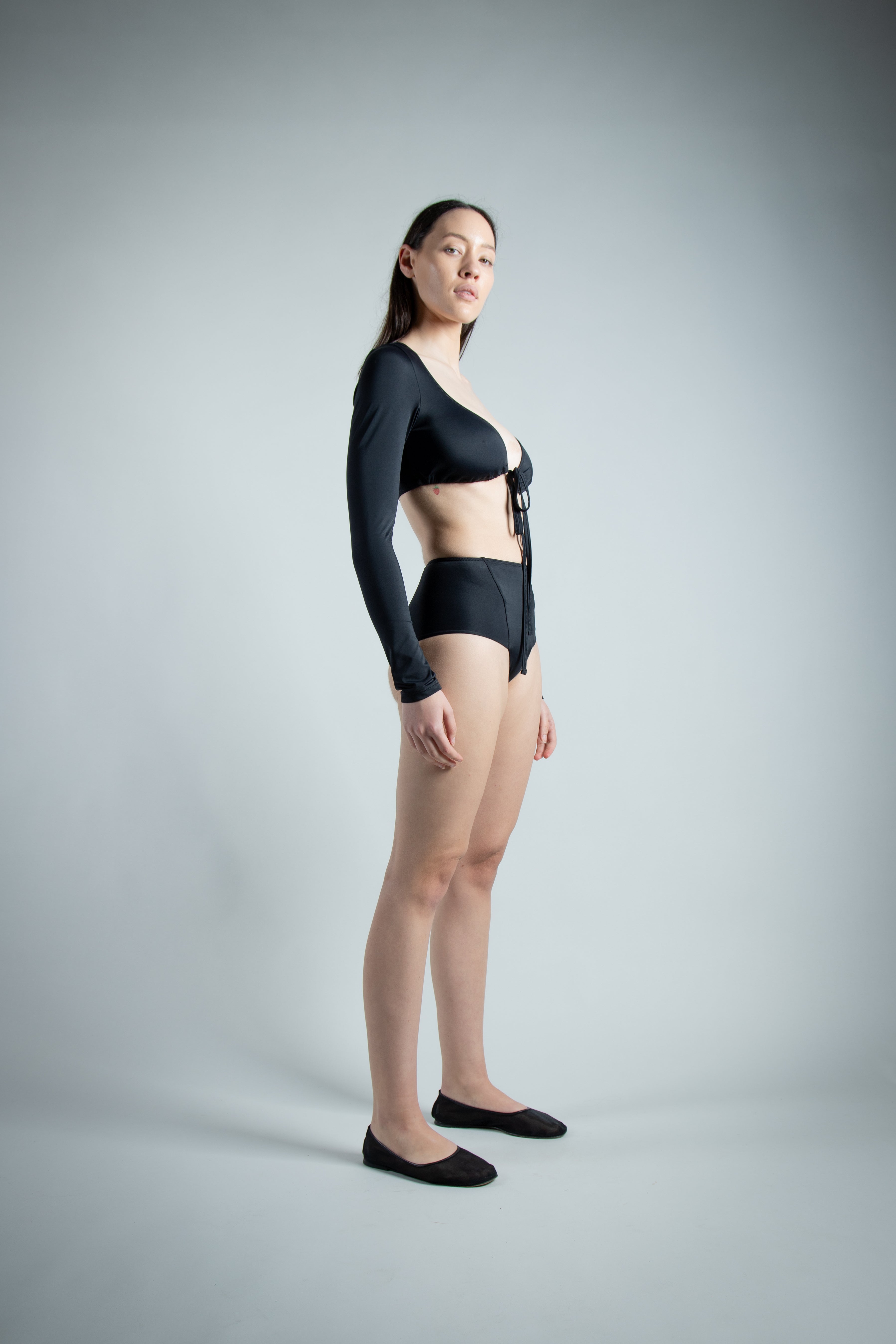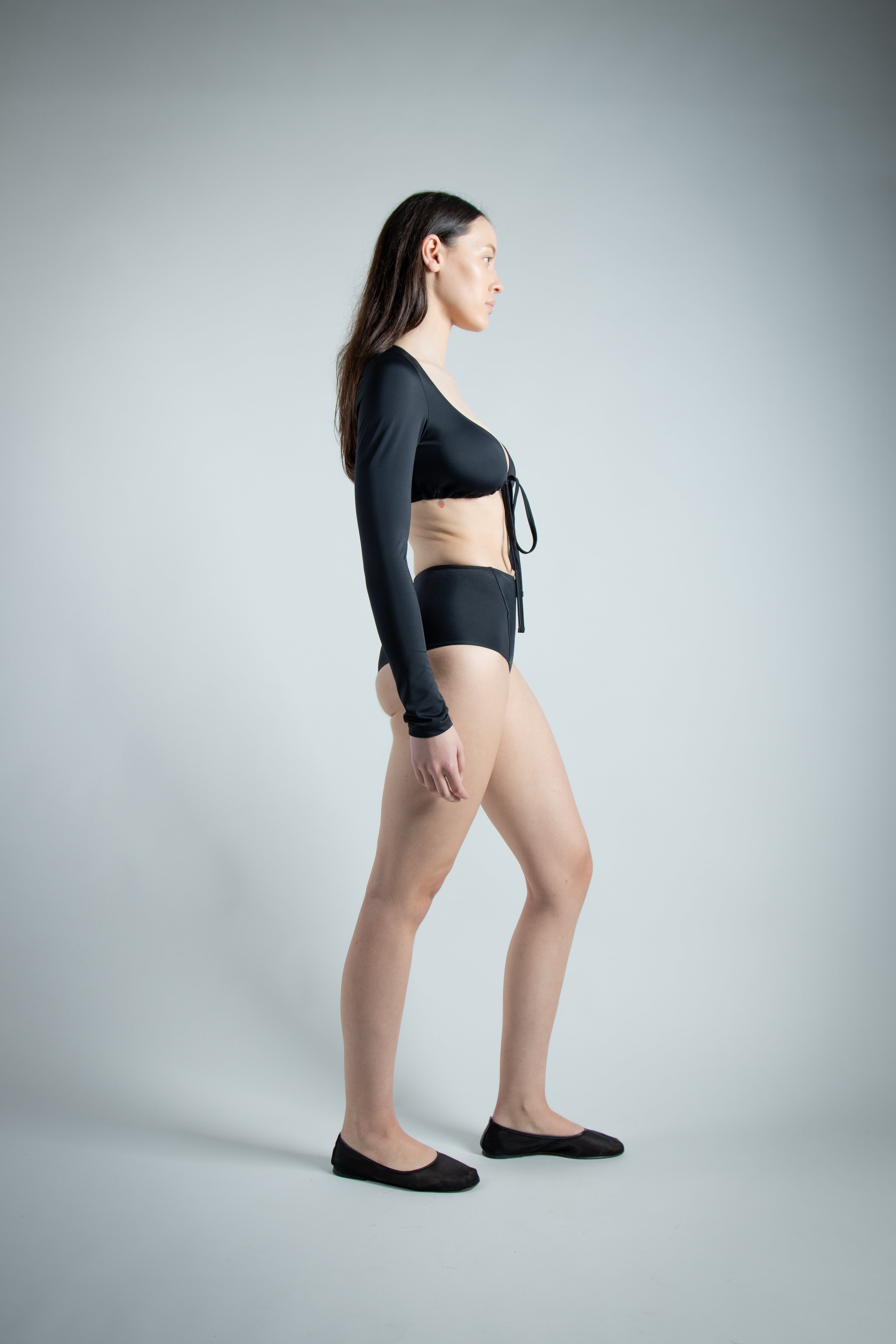 Full coverage swim briefs now with a lower leg through the front for more coverage. No rubber elastic around the back edges, to avoid digging in. Made with ECONYL®  regenerated nylon with SPF 50+ sun protection, providing the piece with strength, complete coverage, and high chlorine resistance.