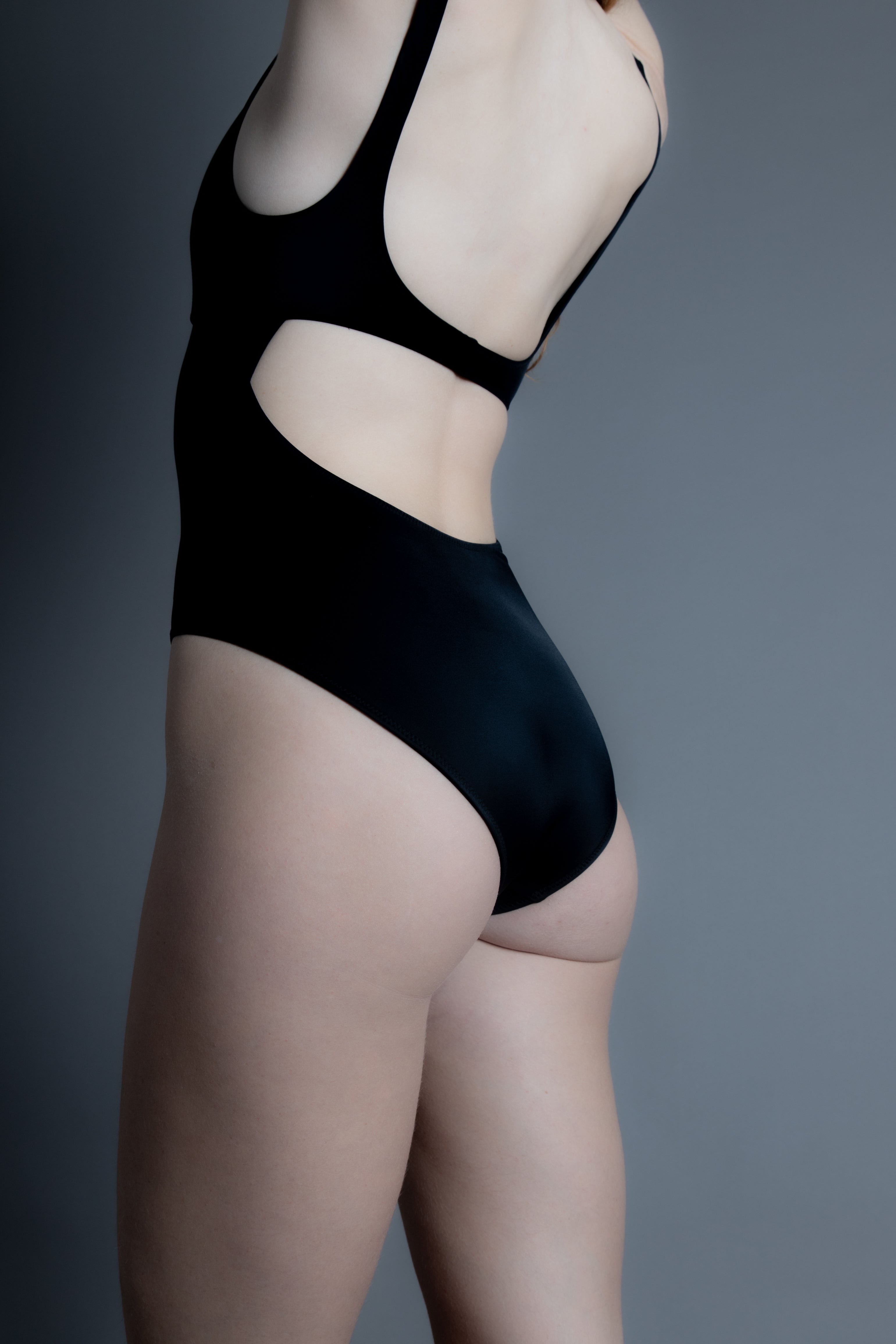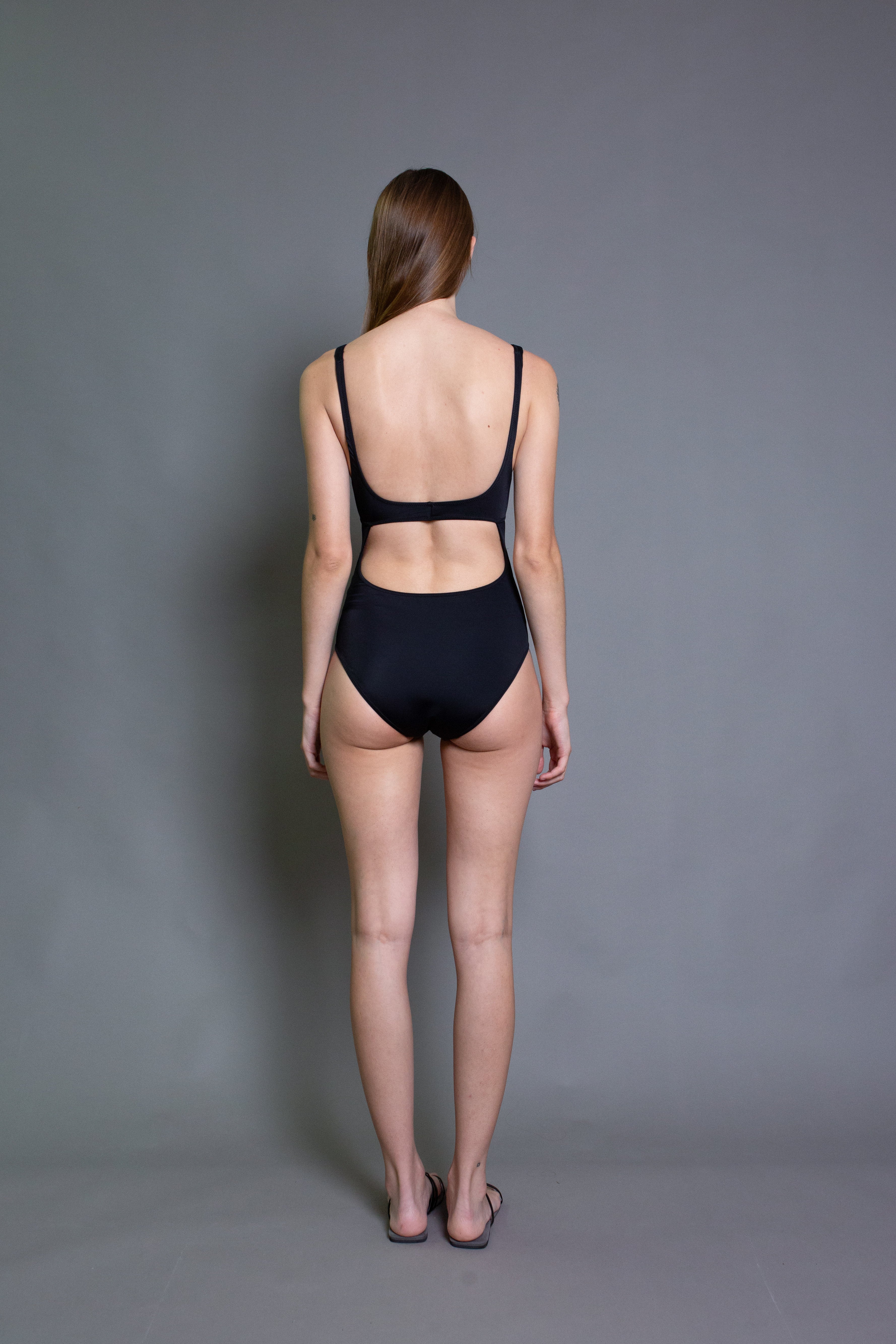 One-piece swimsuit with bikini top bralette. Rubber elastic under bust for support. Nickel-free hook at the centre front to make getting into your swimsuit easier. Made with ECONYL®  regenerated nylon with SPF 50+ sun protection, providing the piece with strength, complete coverage, and high chlorine resistance. Double layered high cut style, with full coverage through the back. Edged with concealed rubber elastic internally, to hold the swimsuit in place.