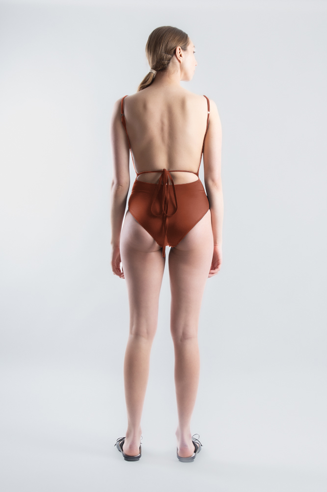 One-piece swimsuit with scooped low back and adjustable straps. Ties at the waist for an adjustable waist fit and rubber elastic under bust for support. Made with ECONYL®  regenerated nylon with SPF 50+ sun protection, providing the piece with strength, complete coverage, and high chlorine resistance. Double layered high cut style, with full coverage through the back. Edged with concealed rubber elastic internally, to hold the swimsuit in place.