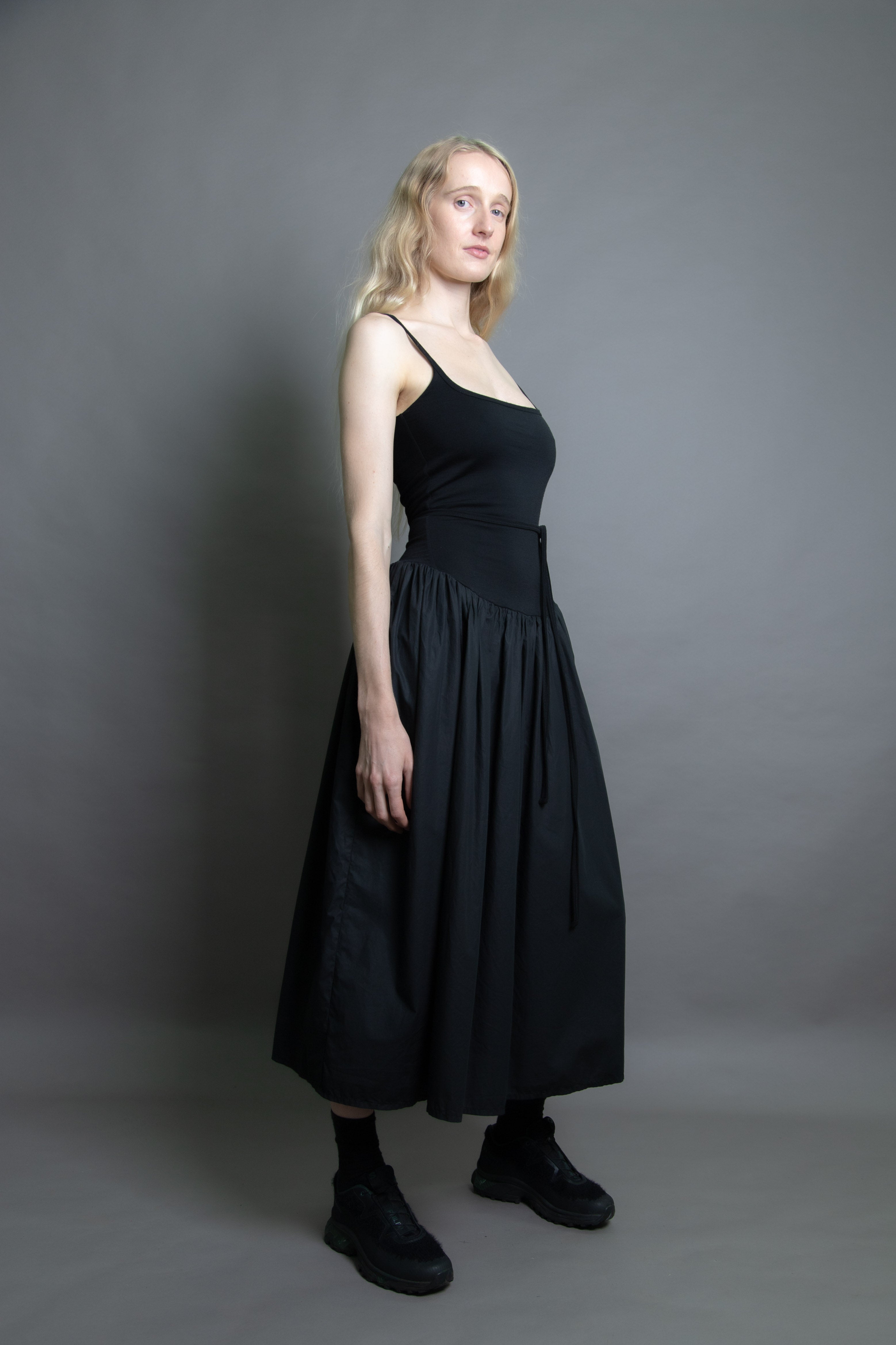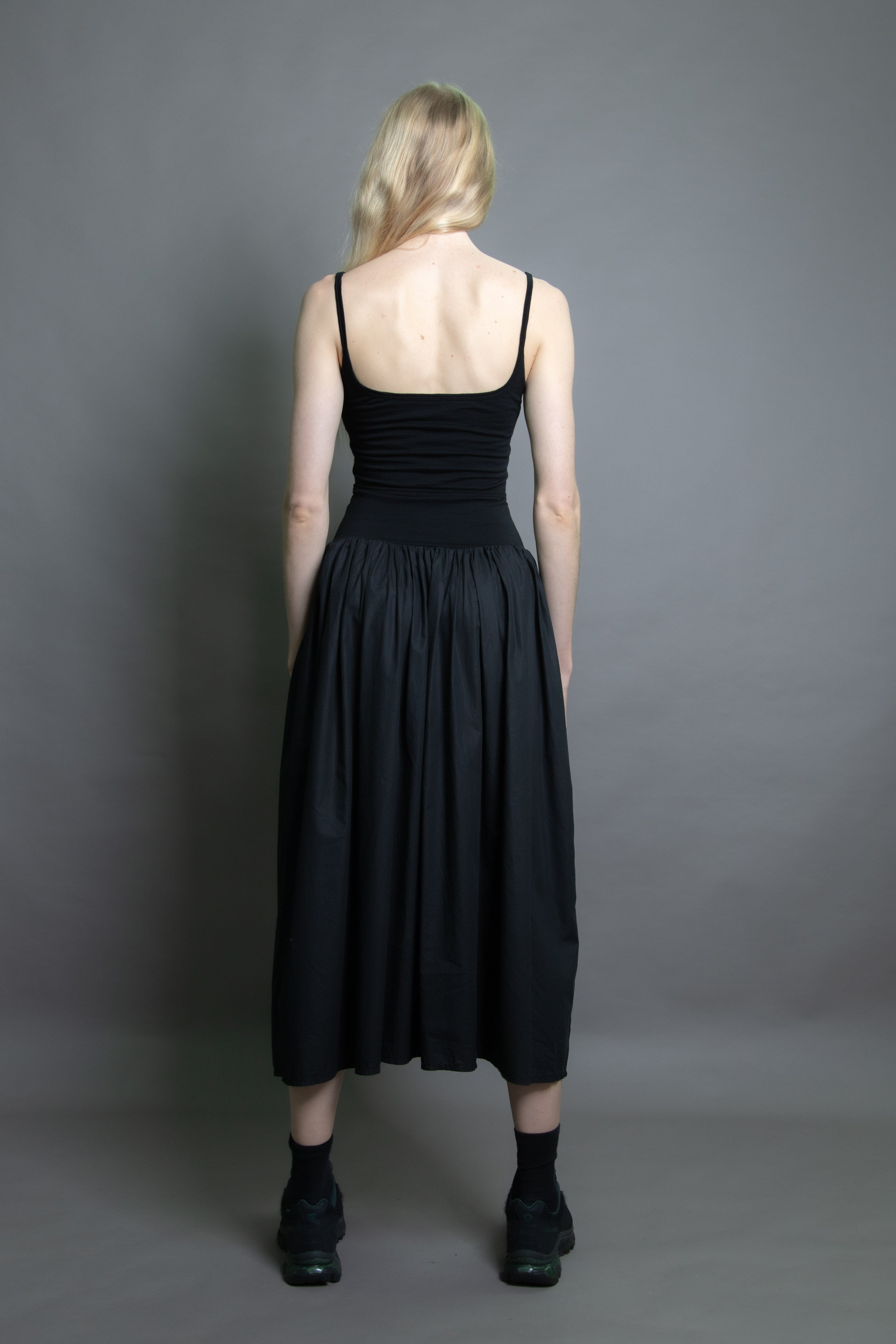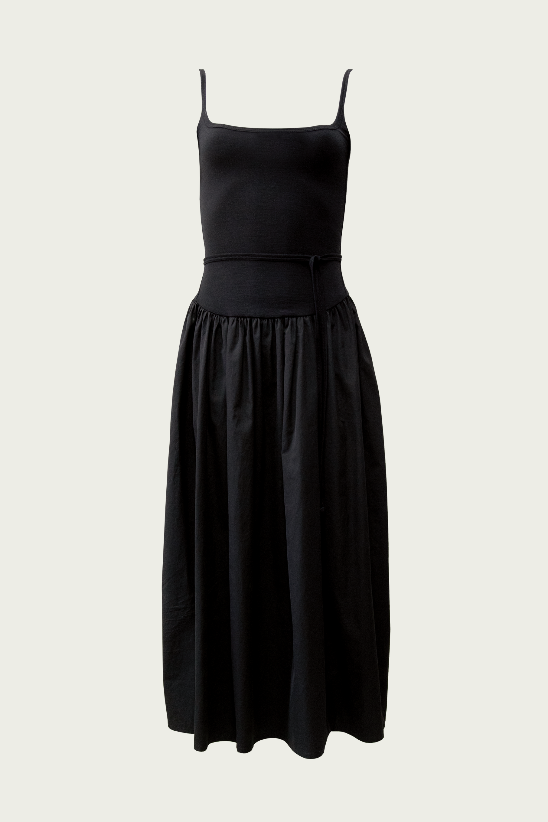 Merino jersey fitted bodice with gathered cotton skirt. Double layered through the body for structure and support, featuring our signature Jack Cami neckline. Drop waist with skirt positioned at just the right height. Detachable waist tie.