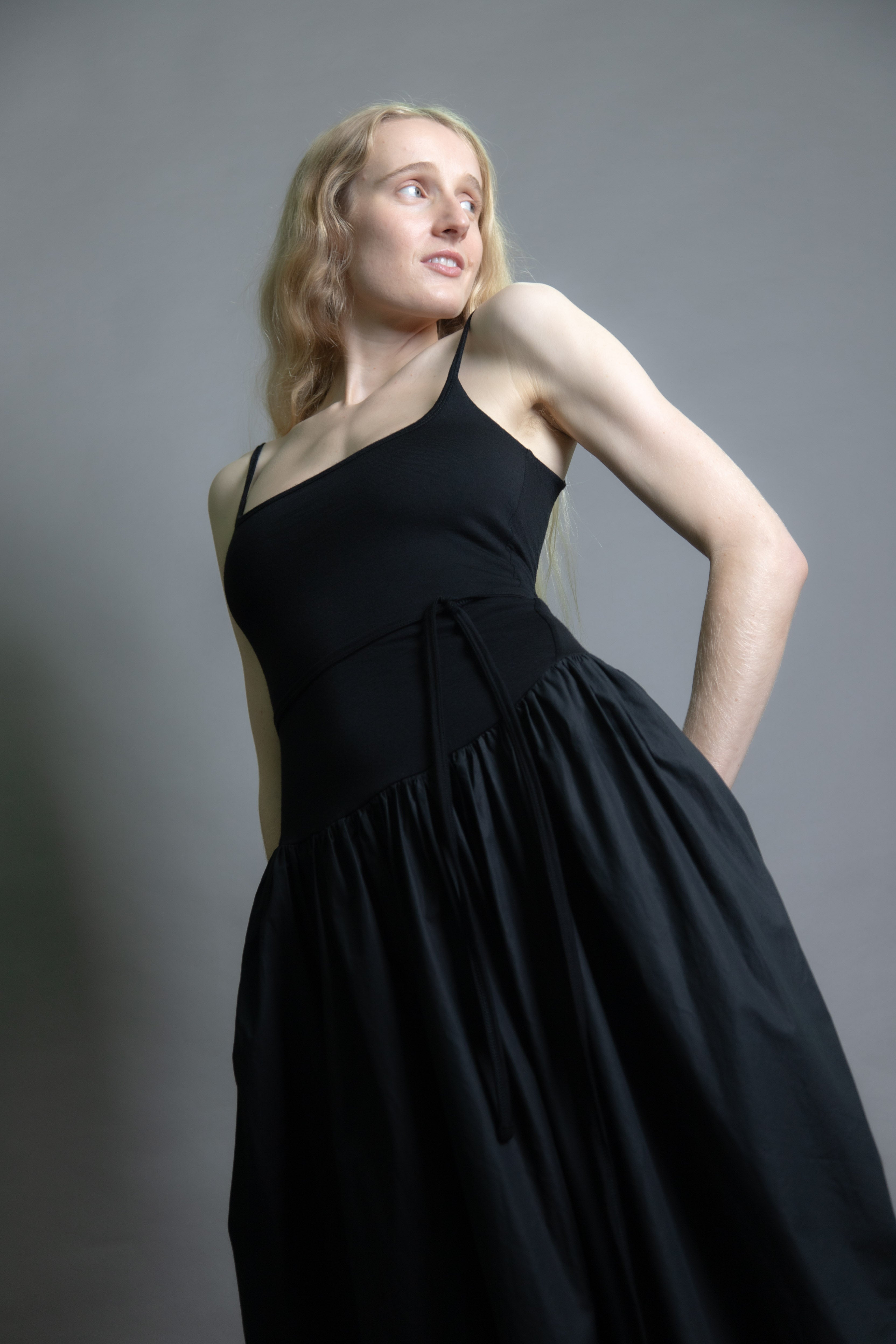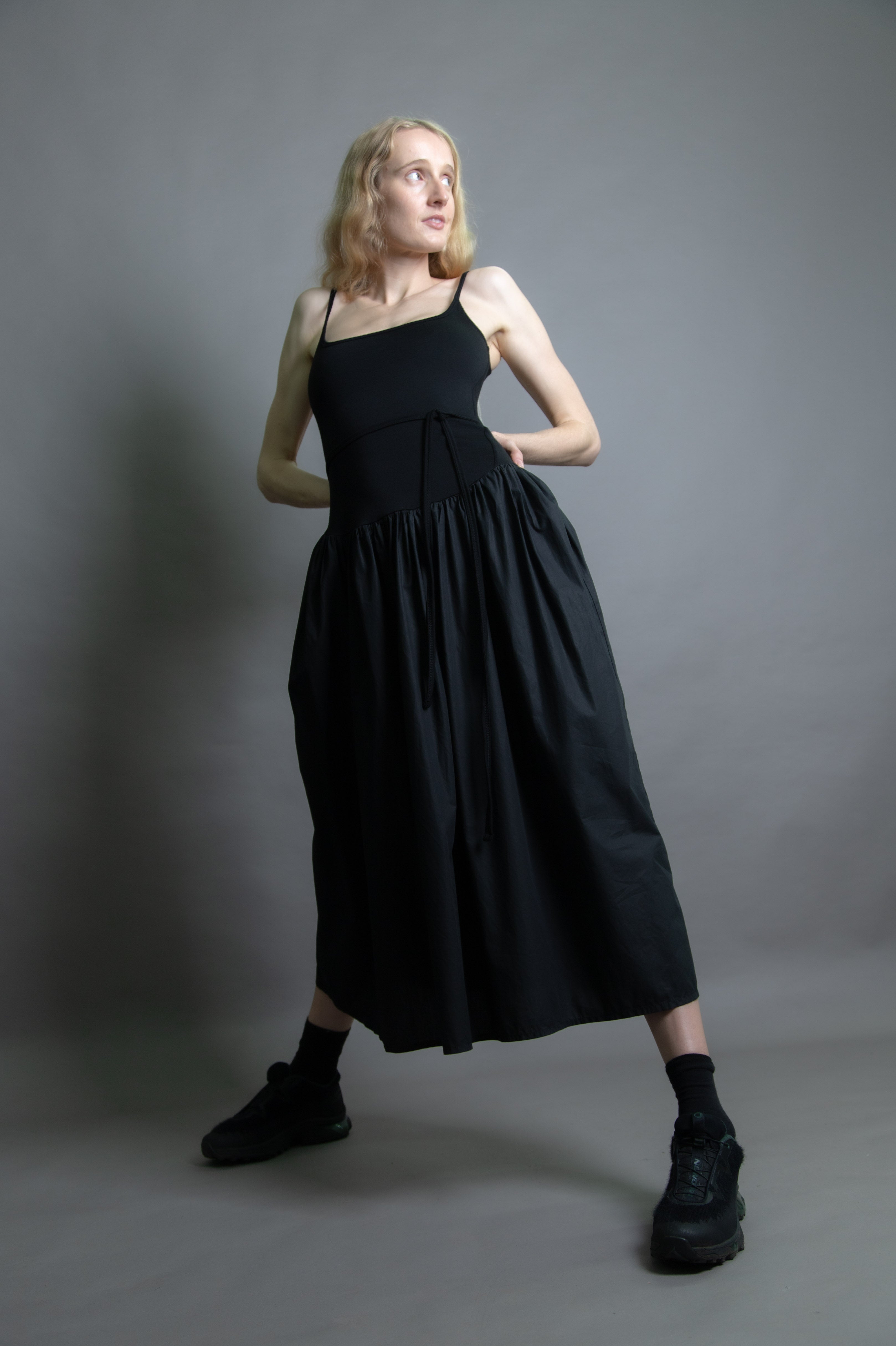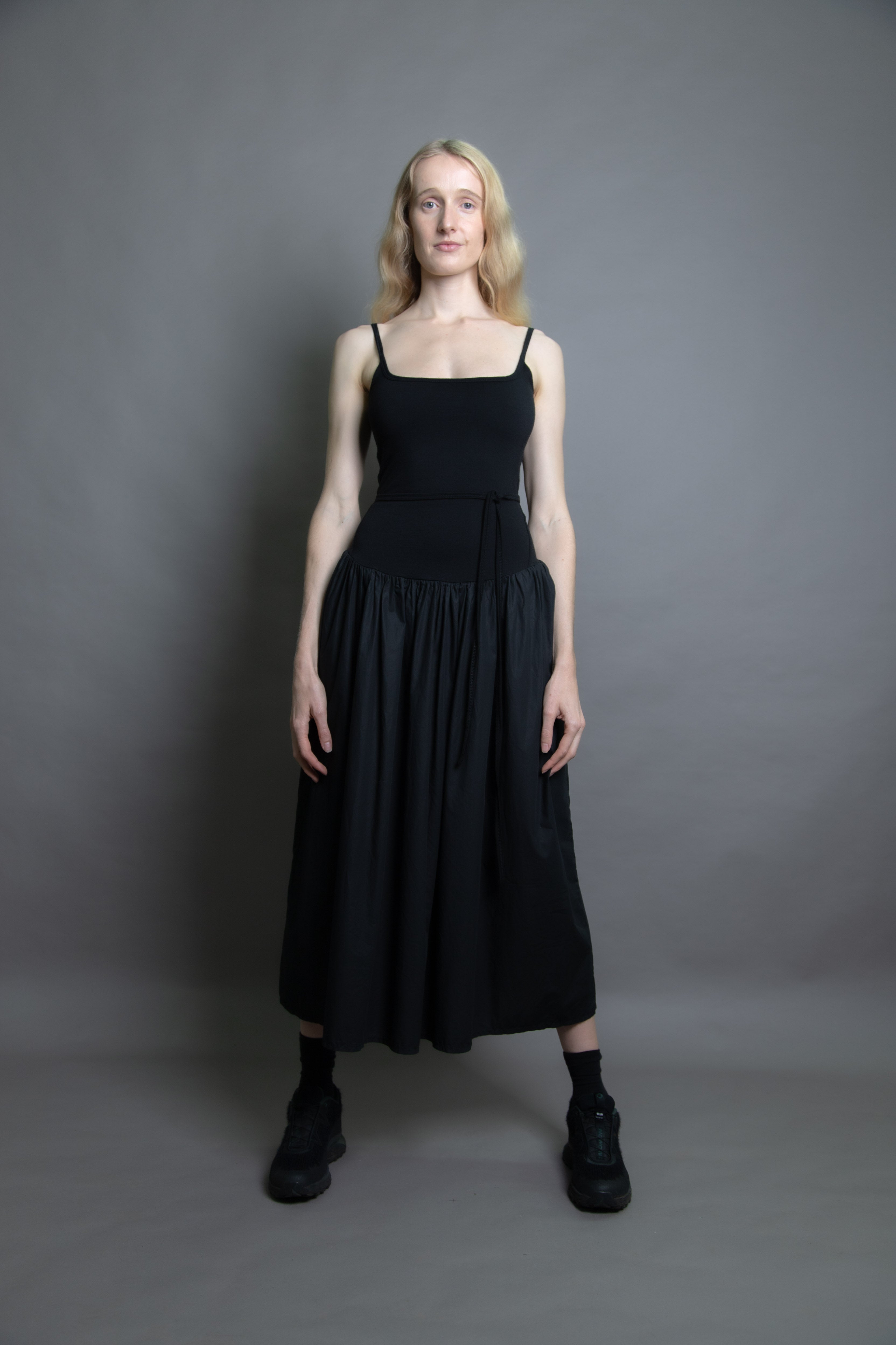 Merino jersey fitted bodice with gathered cotton skirt. Double layered through the body for structure and support, featuring our signature Jack Cami neckline. Drop waist with skirt positioned at just the right height. Detachable waist tie.