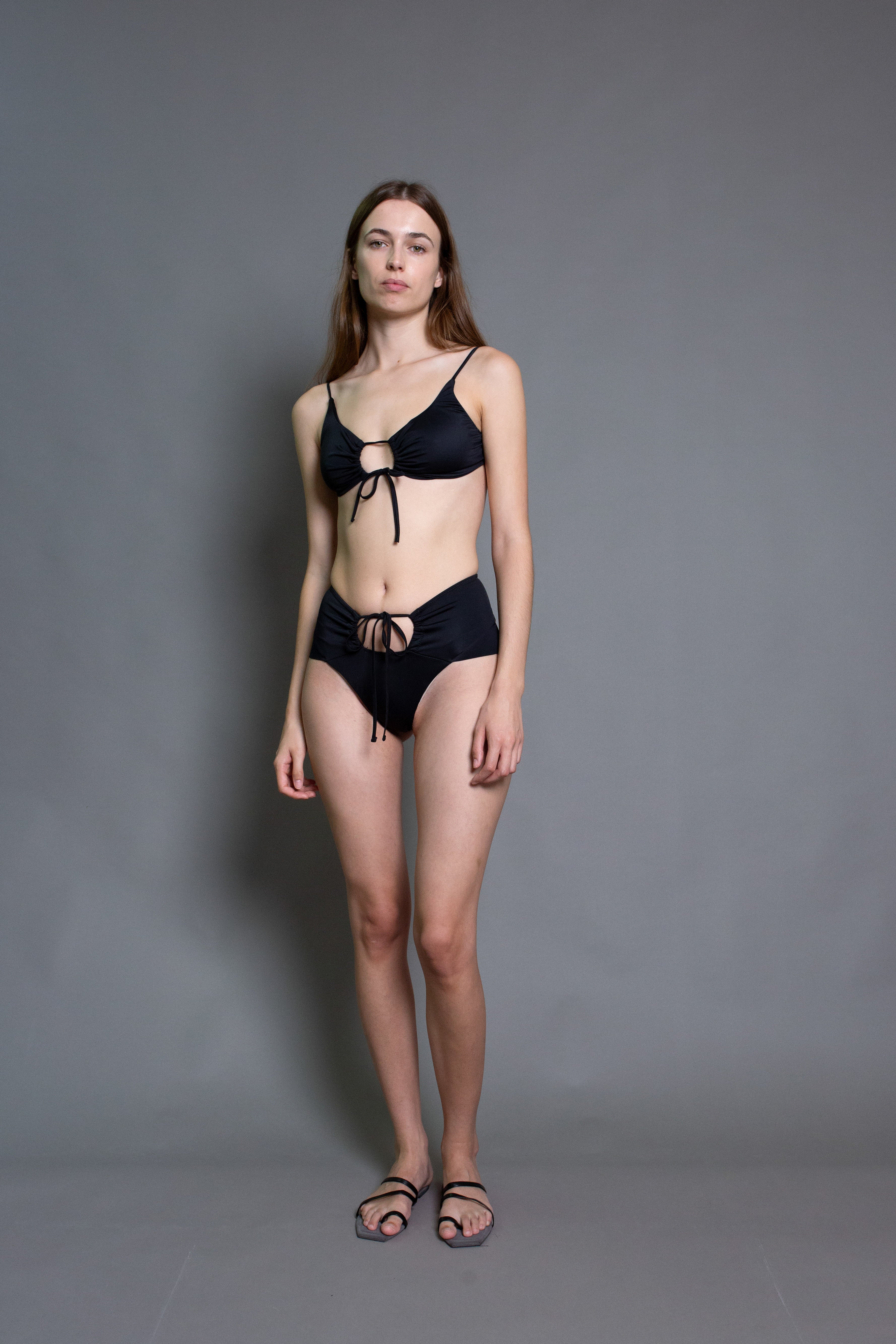 Adjustable tie back bikini top, with rouched centre cutout. Made with ECONYL®  regenerated nylon with SPF 50+ sun protection, providing the piece with strength, complete coverage, and high chlorine resistance. Double layered style, with a dart for bust shaping. Edged with concealed rubber elastic internally, to hold the swimsuit in place.