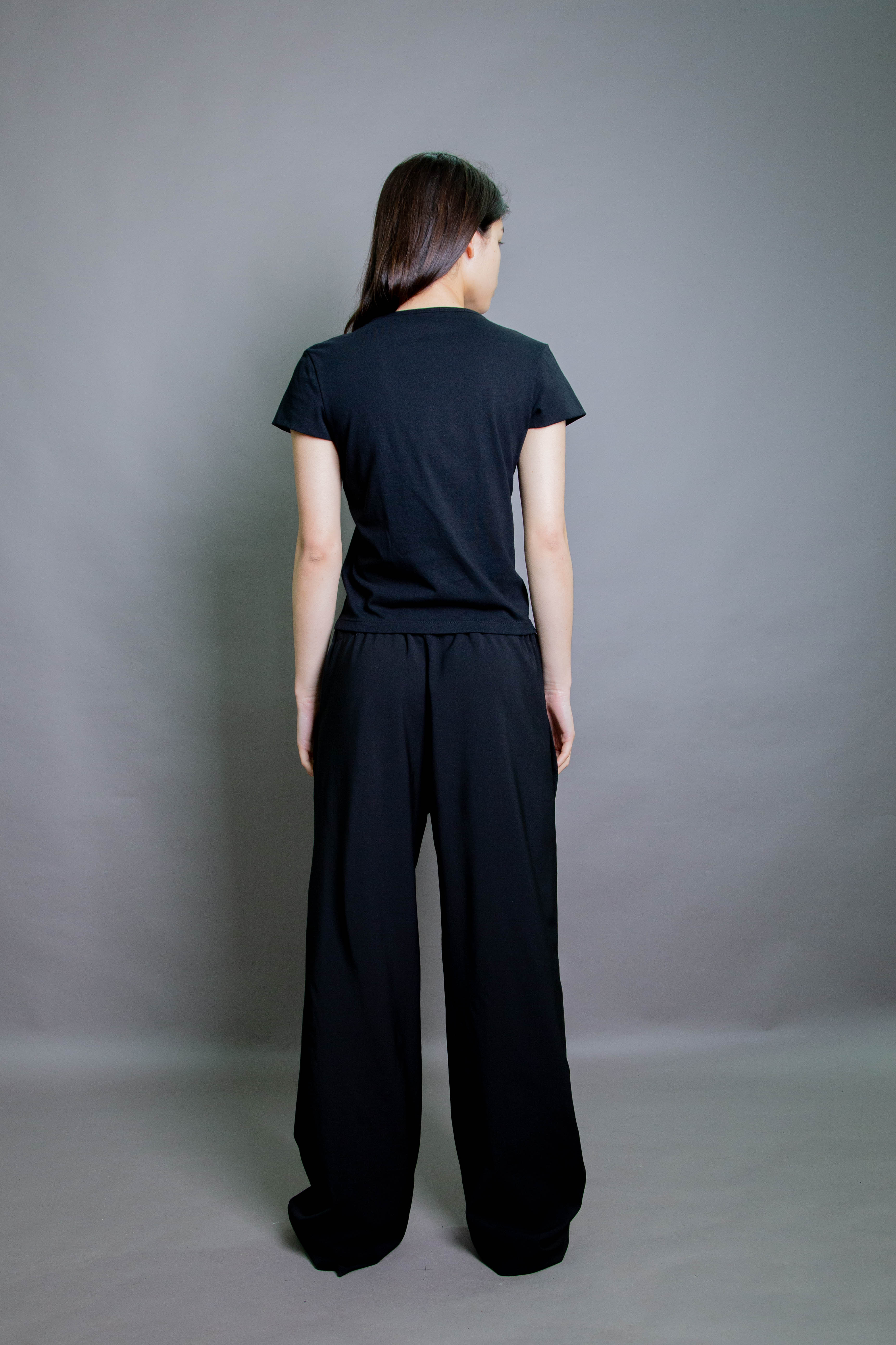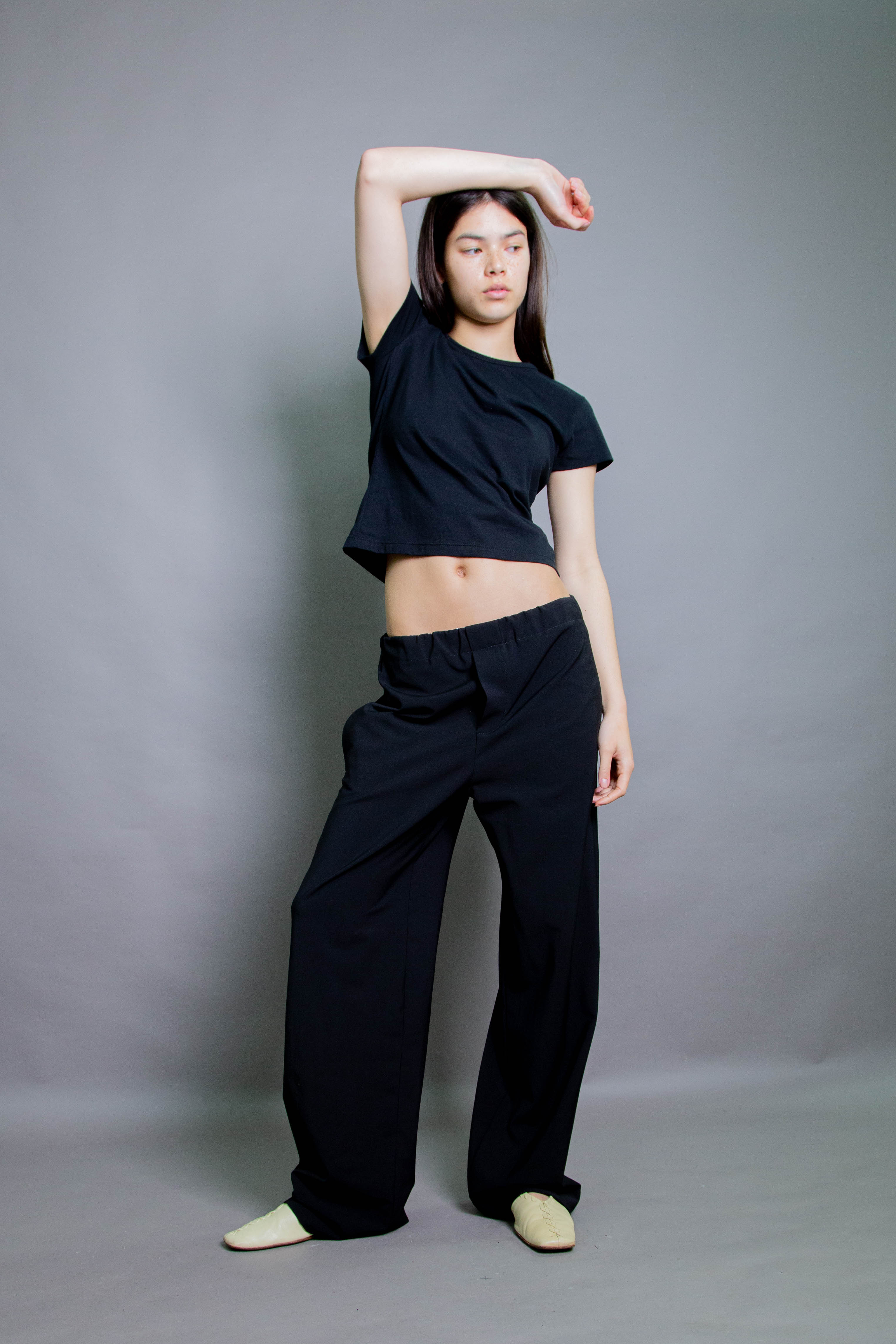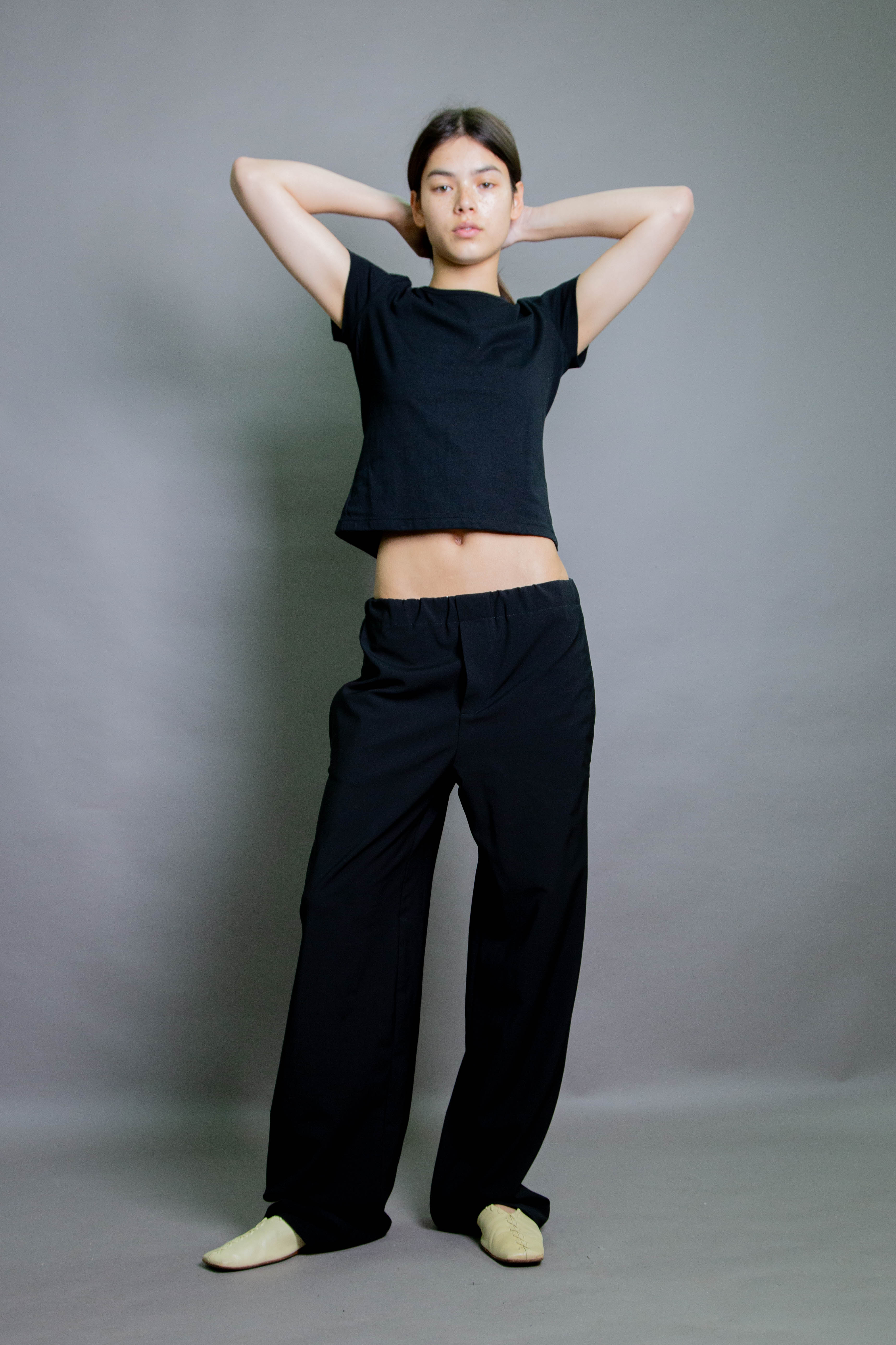 Mid-length fitted t-shirt with bound neckline. Made from a durable organic cotton jersey for a classic baby tee. Double layer sleeved with a folded edge at sleeve hem for a clean finish.